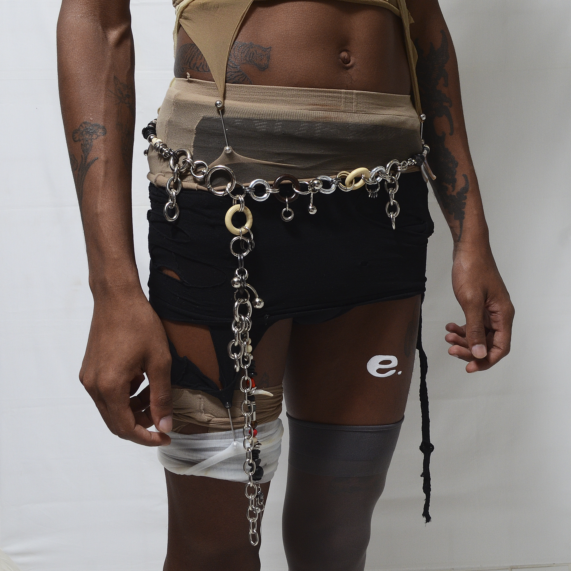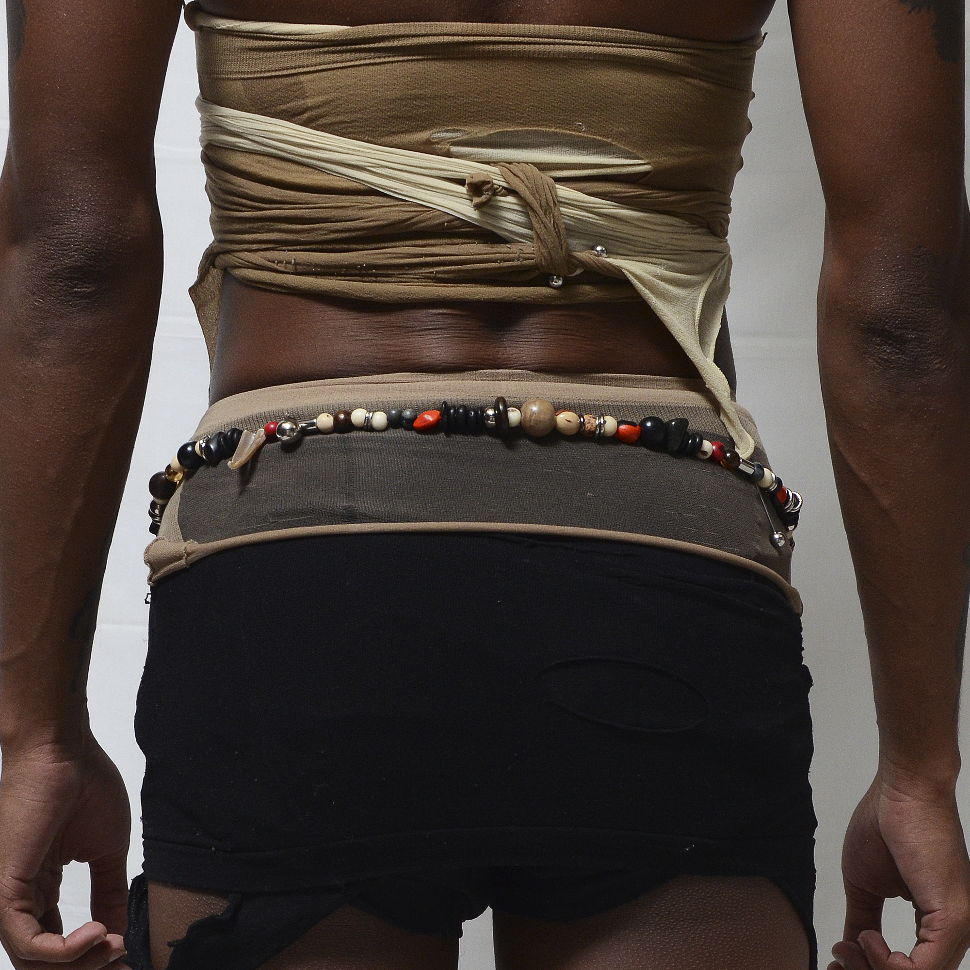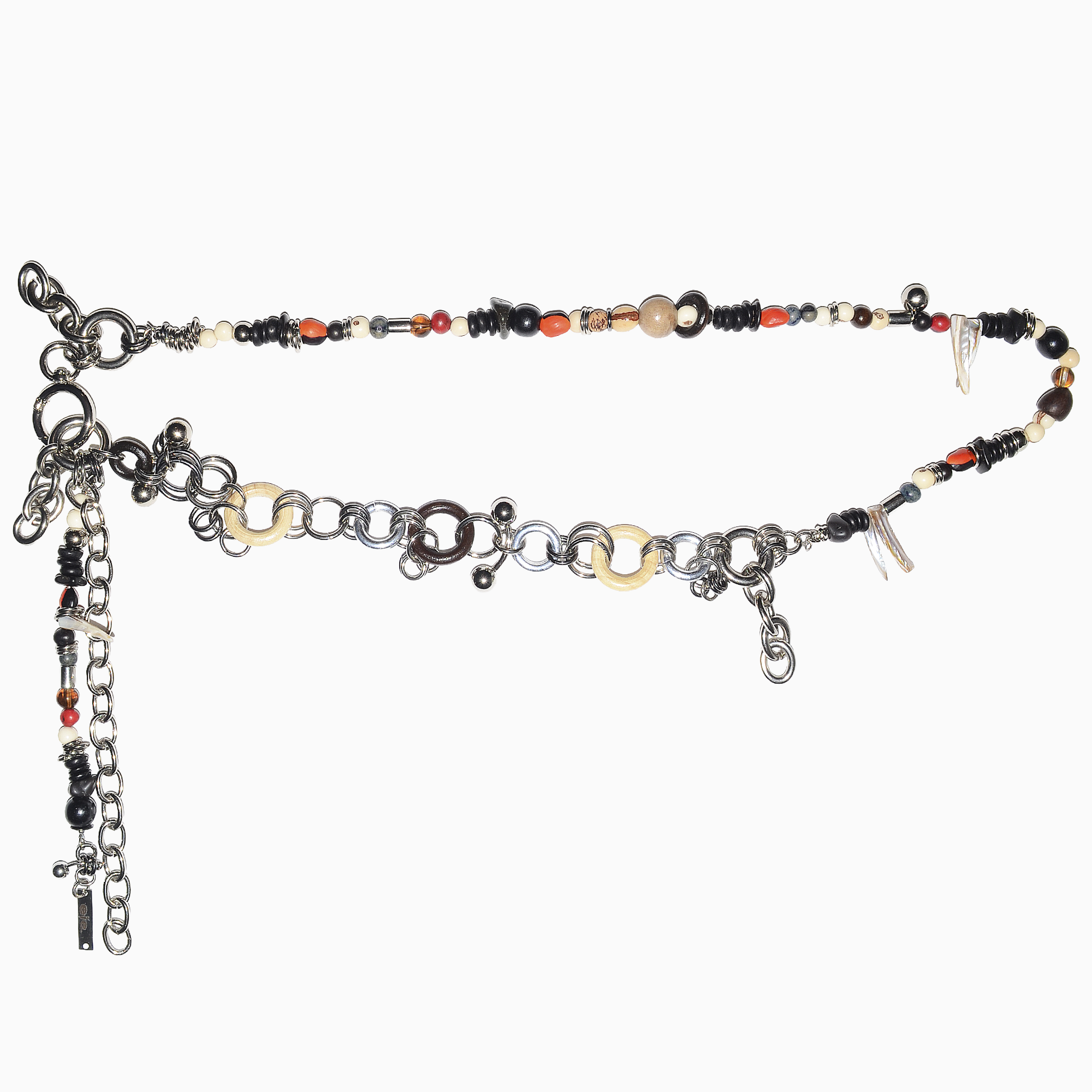 Acessório de corpo produzido artesanalmente com metais em aço niquelado envernizado, alumínio e inox, madeira, sementes de açaí, olho de exu e bacaba, coquinho e coco tucumã madrepérola, pedras jaspe e onix.
