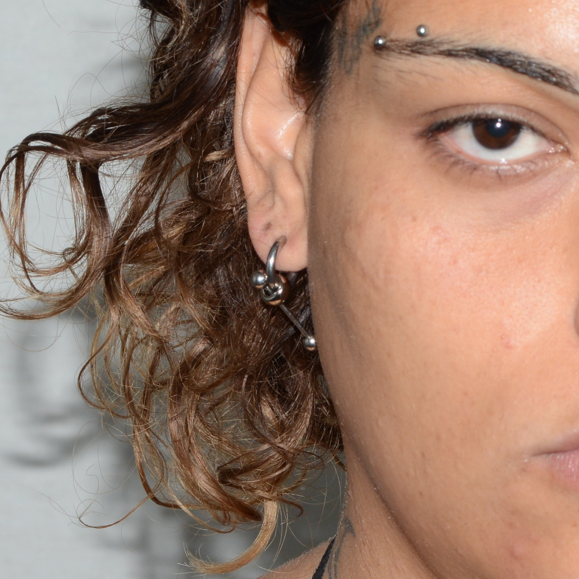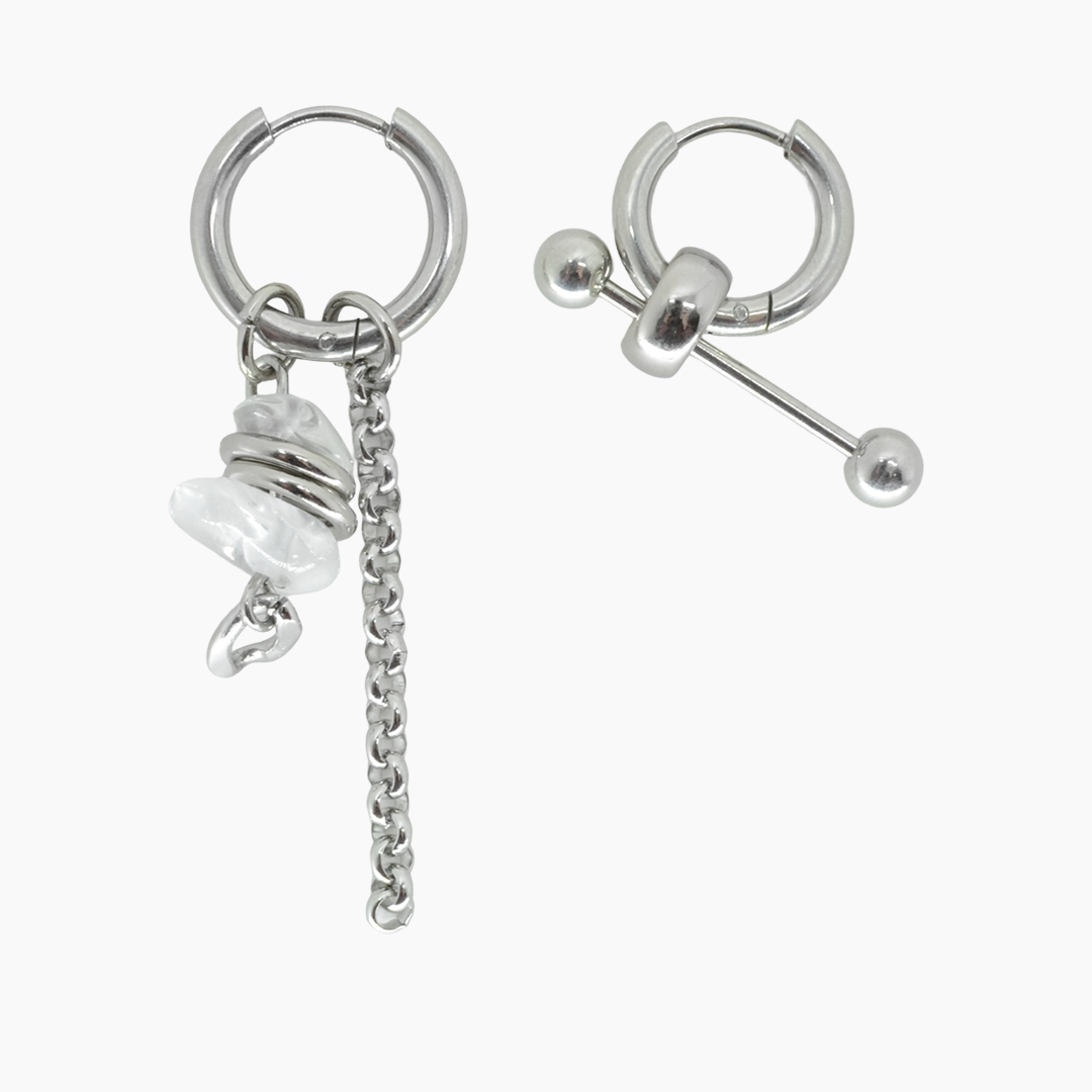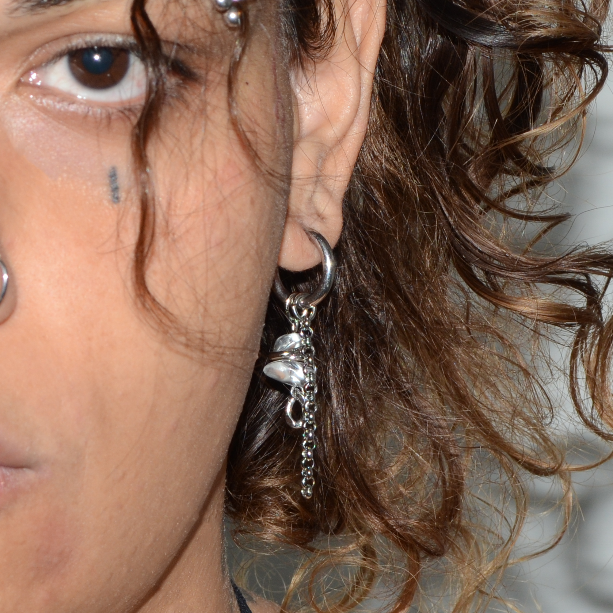 brinco de design único, produzido artesanalmente com base em aço inoxidável, contas de vidro e outros componentes em aço niquelado envernizado.
