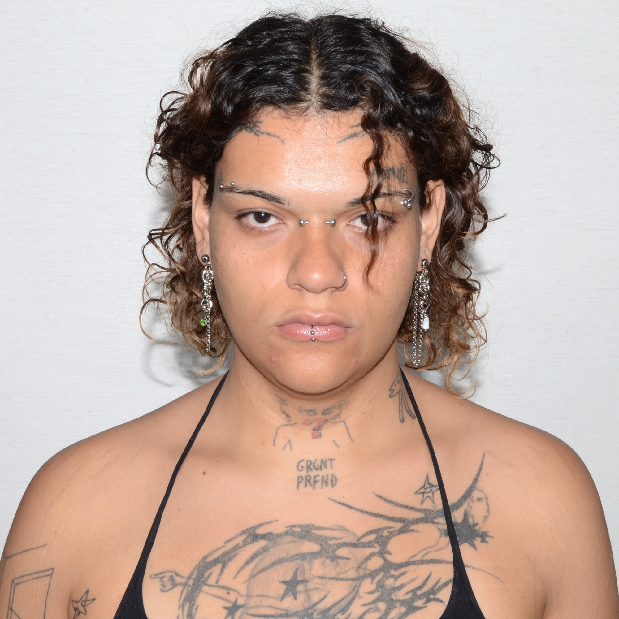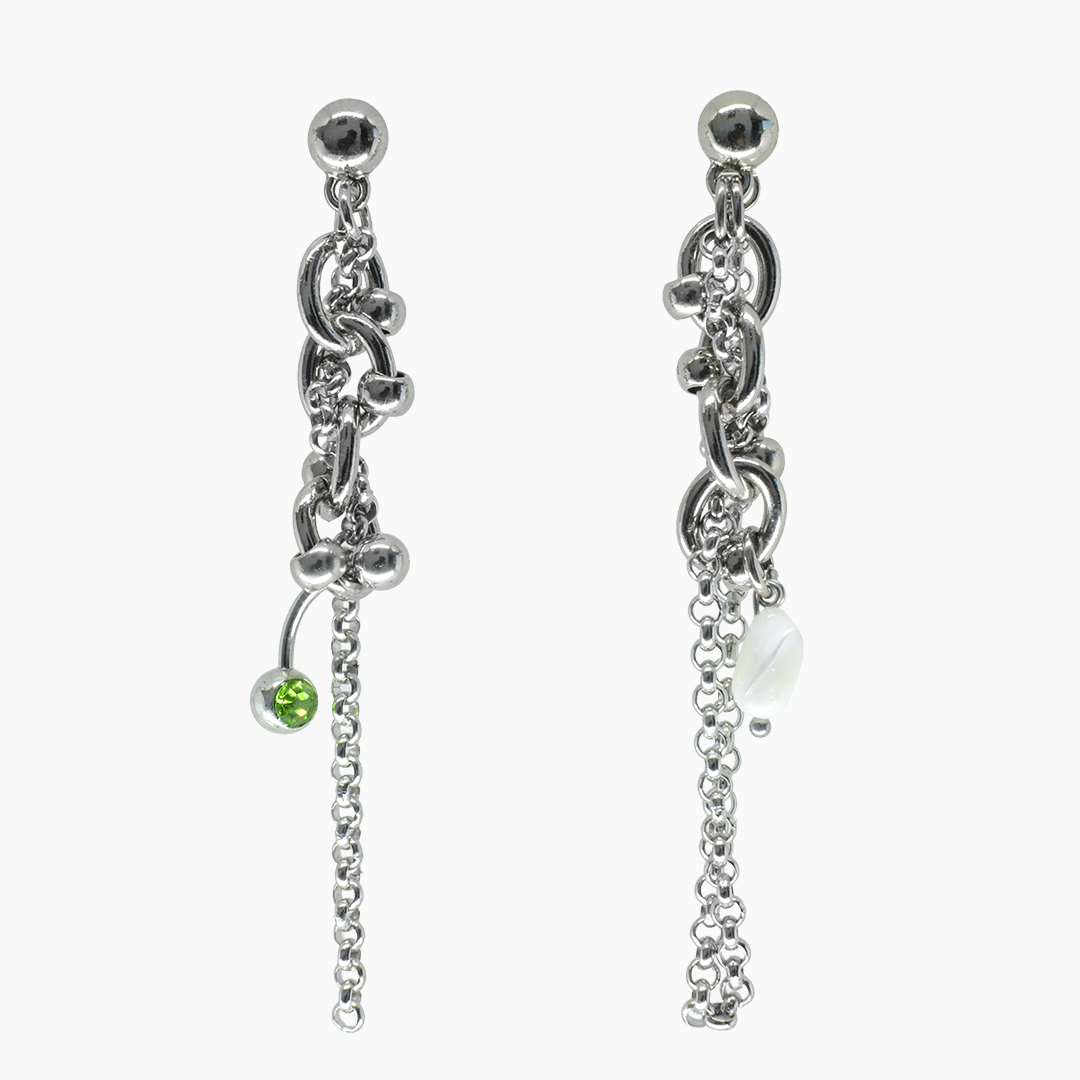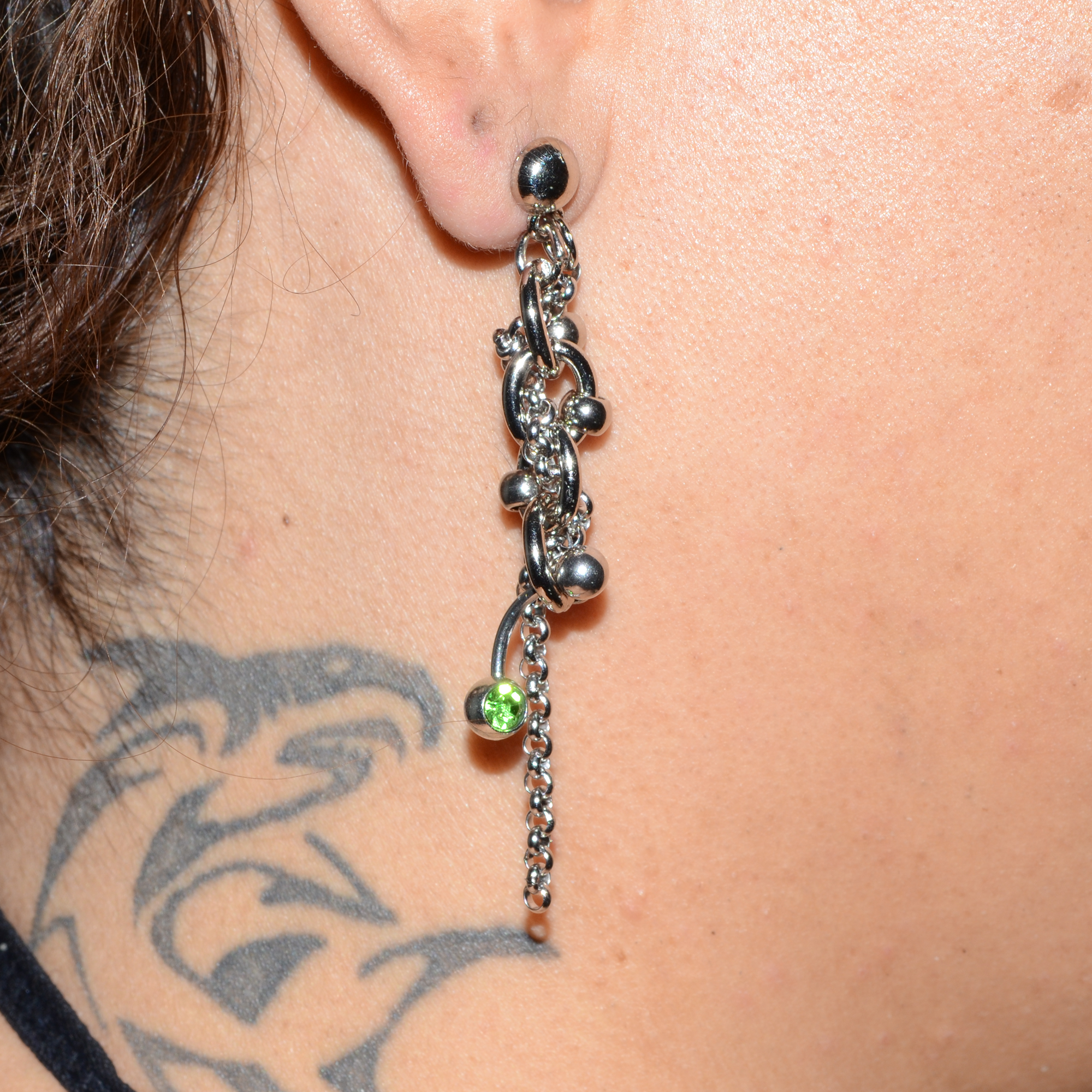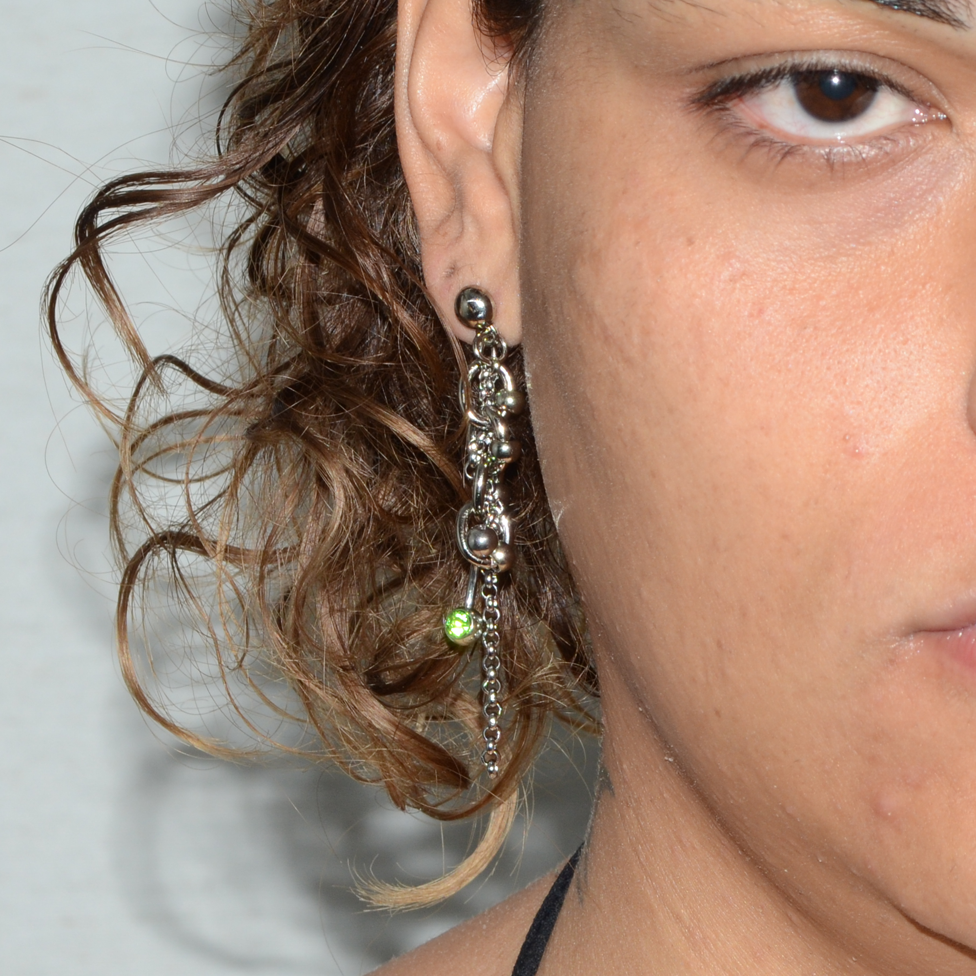 brinco produzido artesanalmente com base sem níquel, conta de madrepérola natural, piercing de aço inoxidável com strass, correntes em aço inoxidável e outros componentes em aço niquelado envernizado.