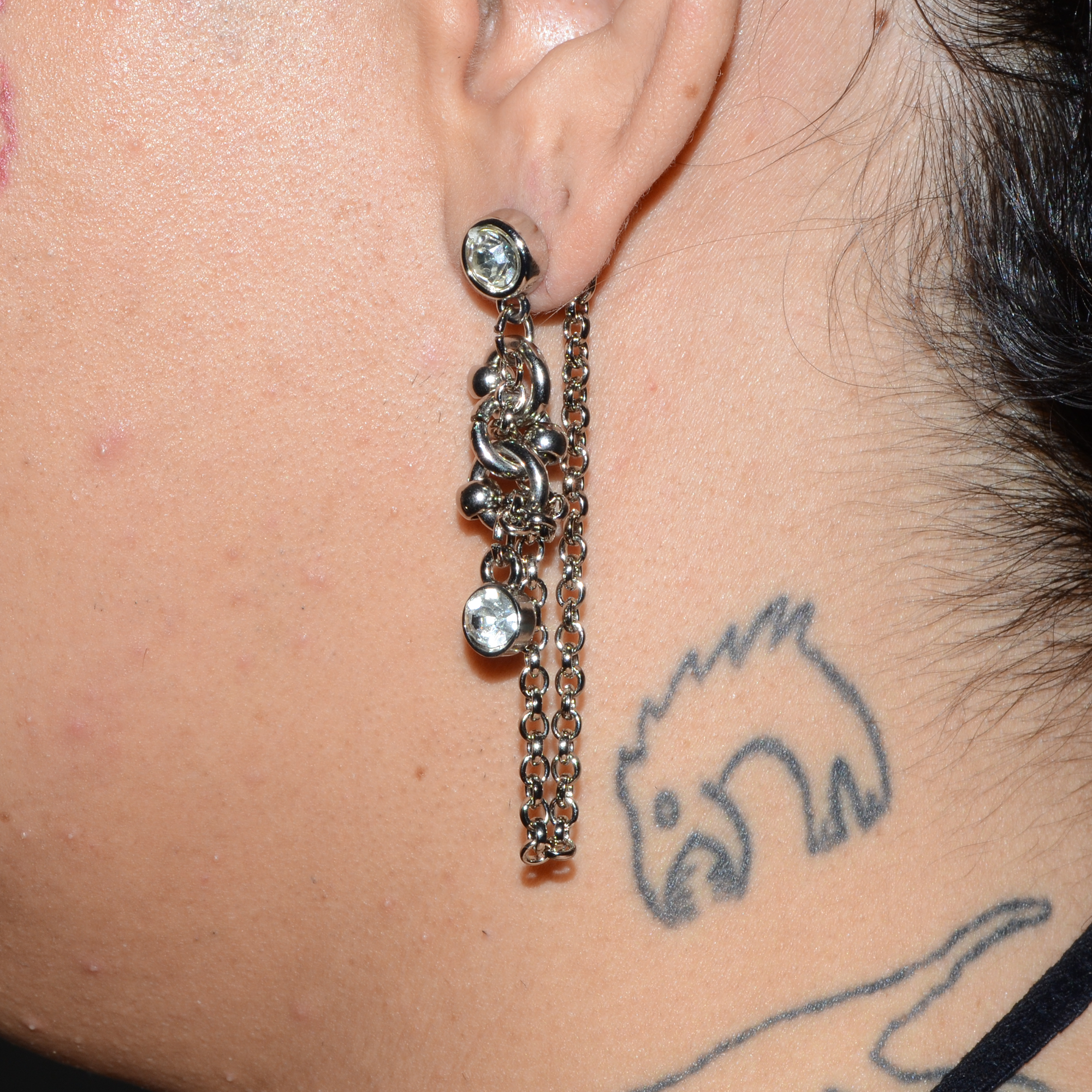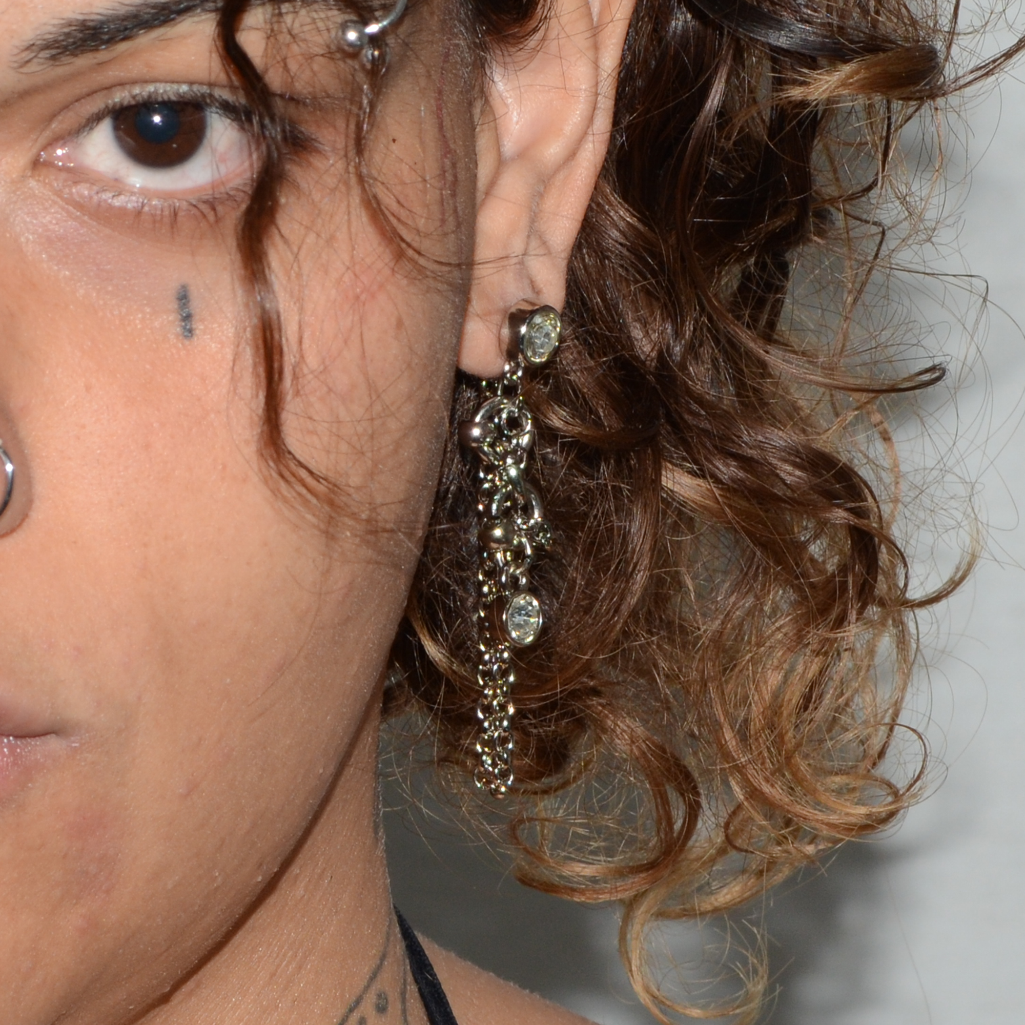 brinco produzido artesanalmente com base sem níquel com strass e outros componentes em aço niquela envernizado.