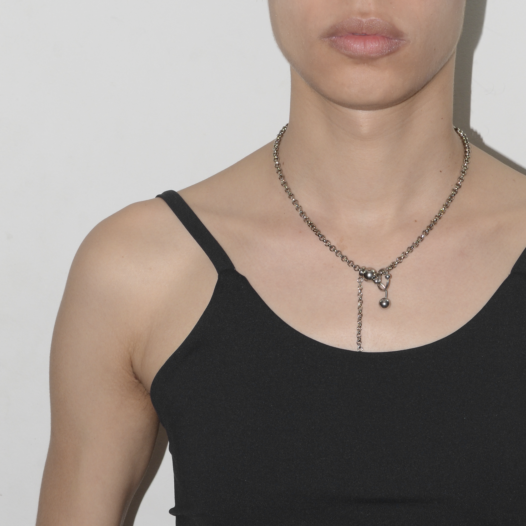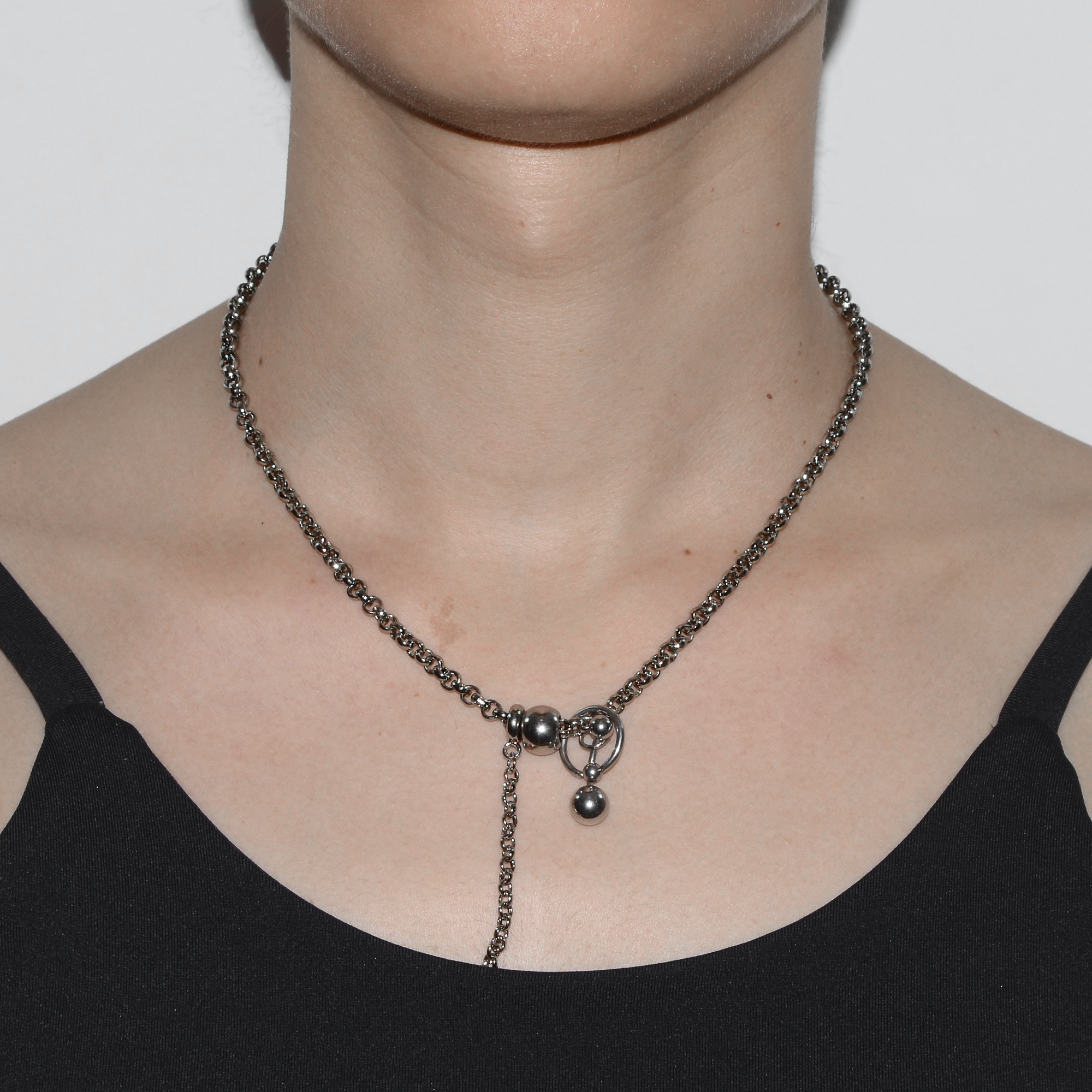 colar produzido artesanalmente com correntes em aço niquelado envernizado e piercings em aço inoxidável.