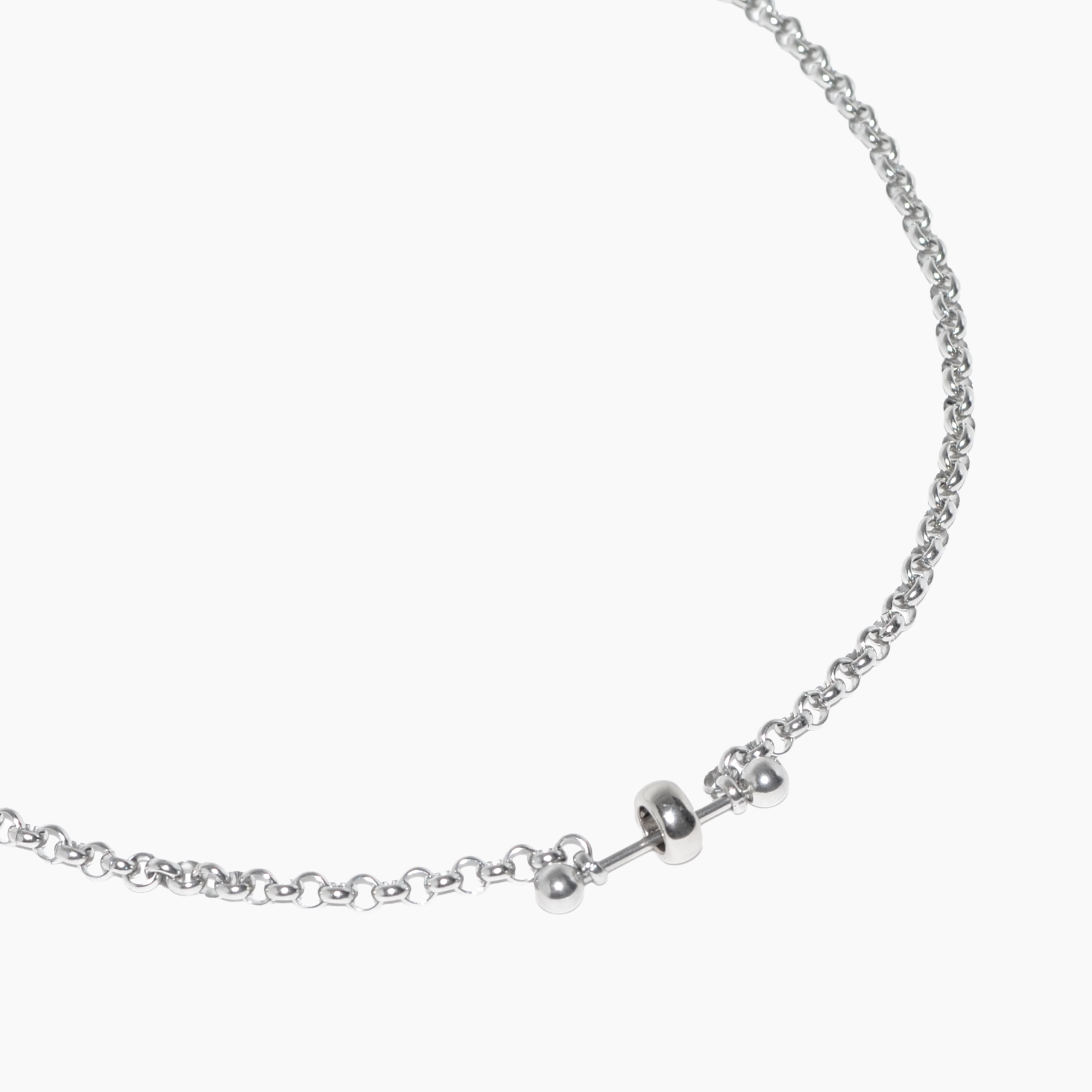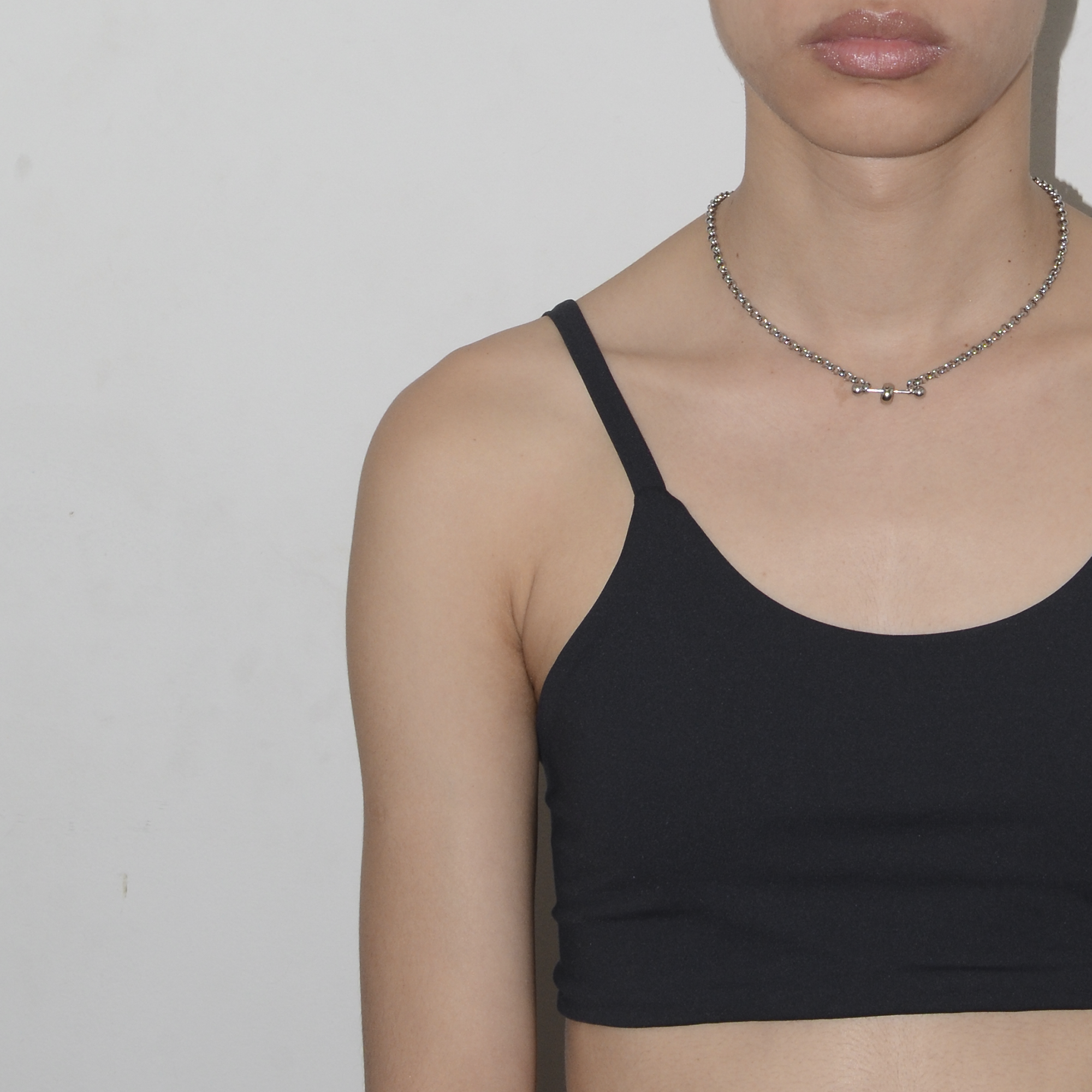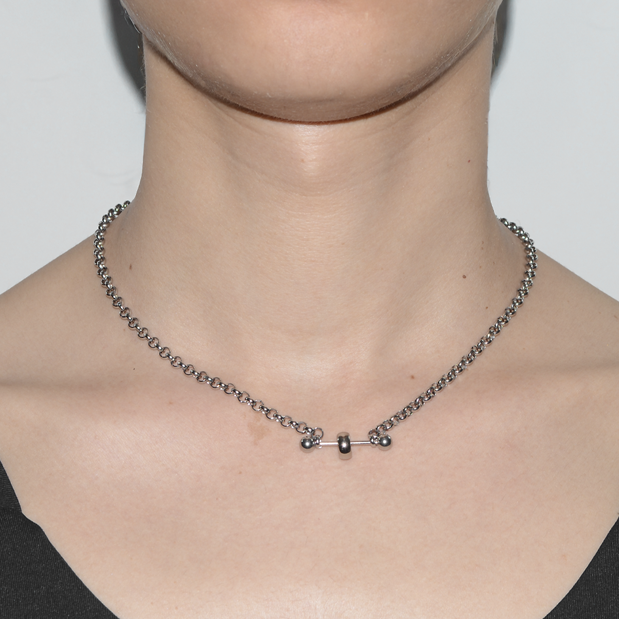 colar produzido artesanalmente com correntes, piercings em aço inoxidável e outros componentes em aço niquelado envernizado.
