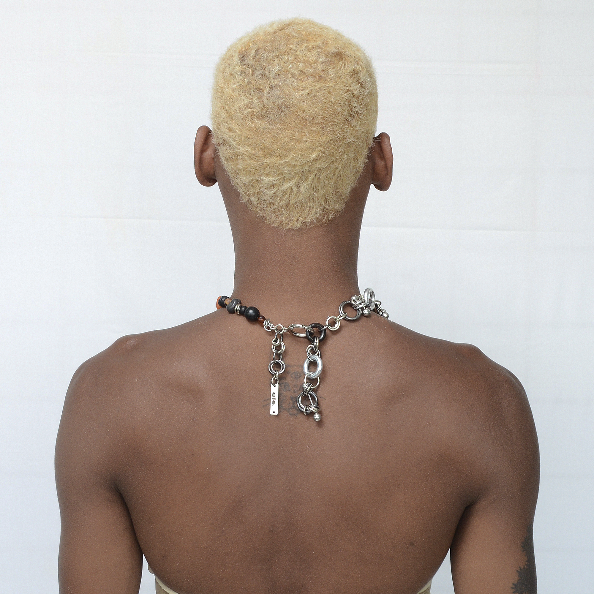 Colar produzido artesanalmente com metais em aço niquelado envernizado, alumínio e inox, madeira, vidro, sementes de açaí, murici e jarina, madrepérola, pedras olho de tigre, onix e hematita.
