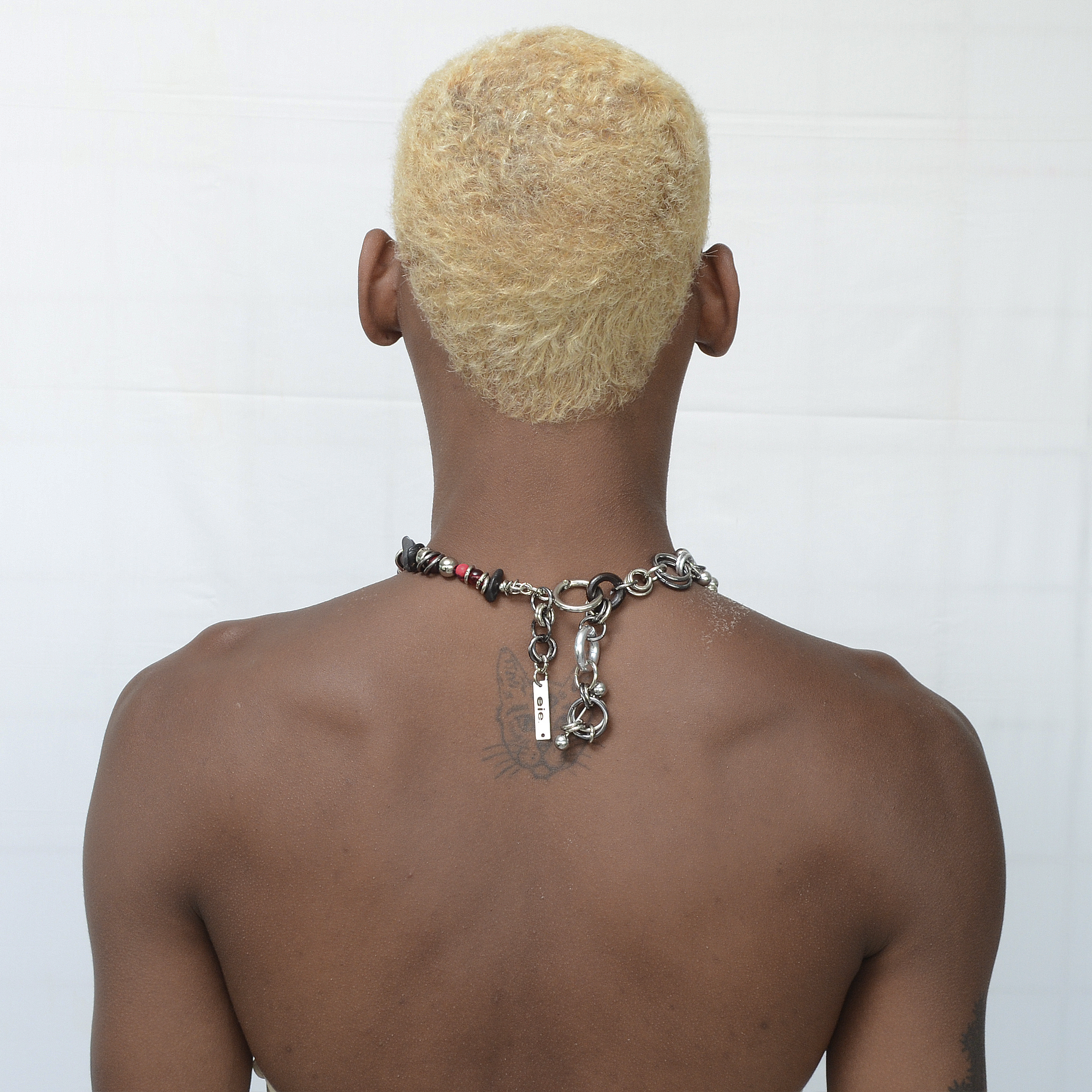 Colar produzido artesanalmente com metais em aço niquelado envernizado, alumínio e inox, madeira, vidro, sementes de açaí e bacaba, coco tucumã, pedra jaspe.