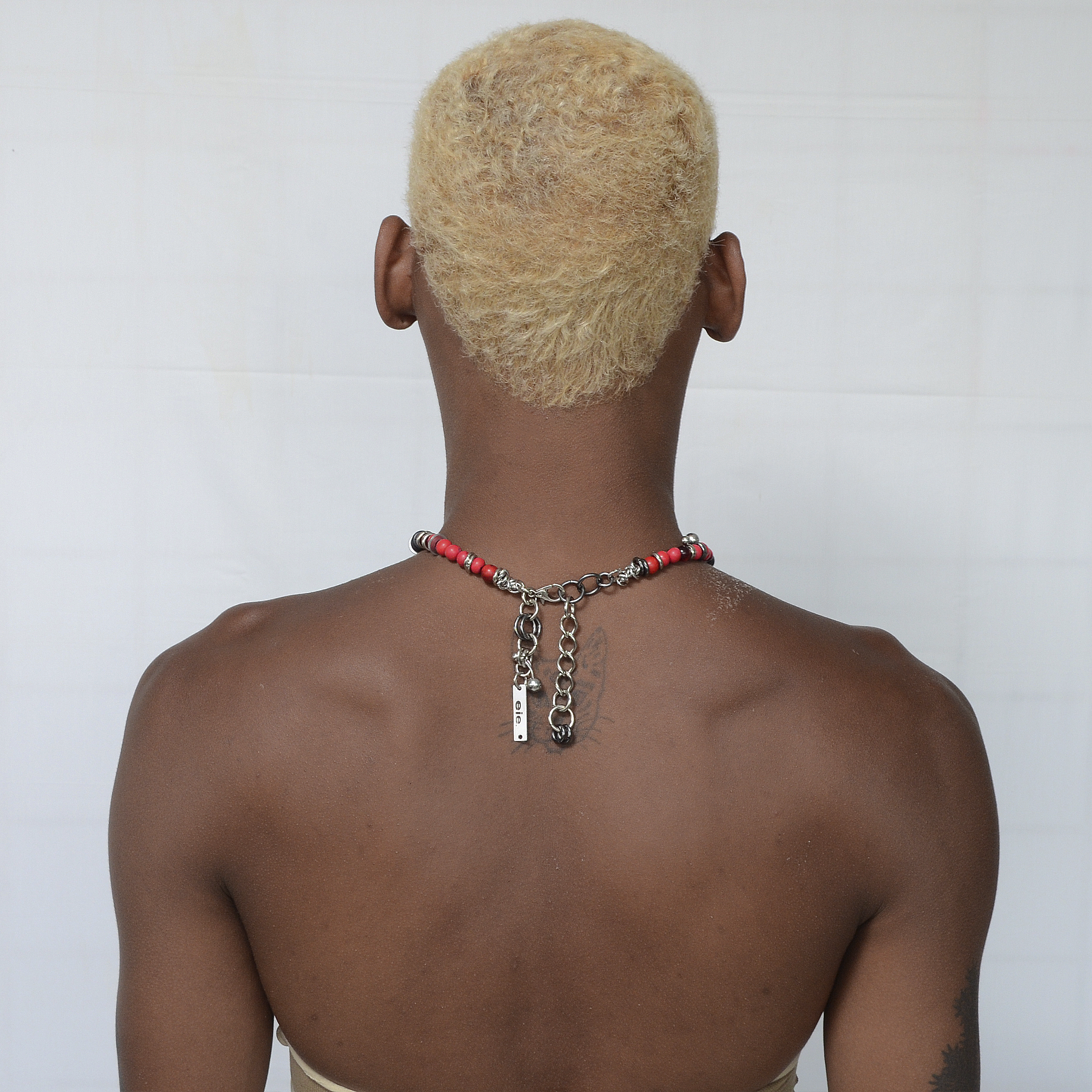 Colar produzido artesanalmente com metais em aço niquelado envernizado e inox, sementes de açaí, coquinho e vidro.