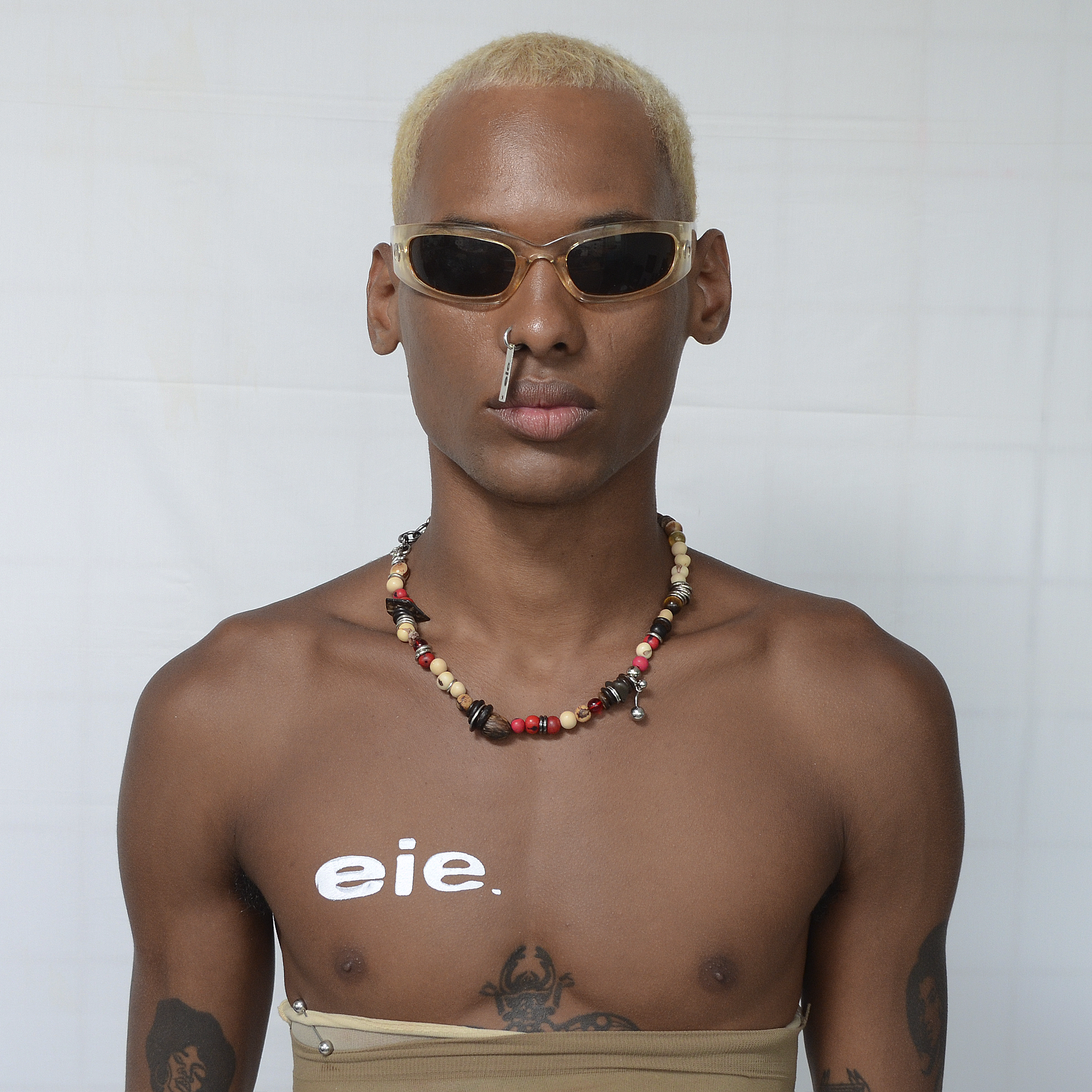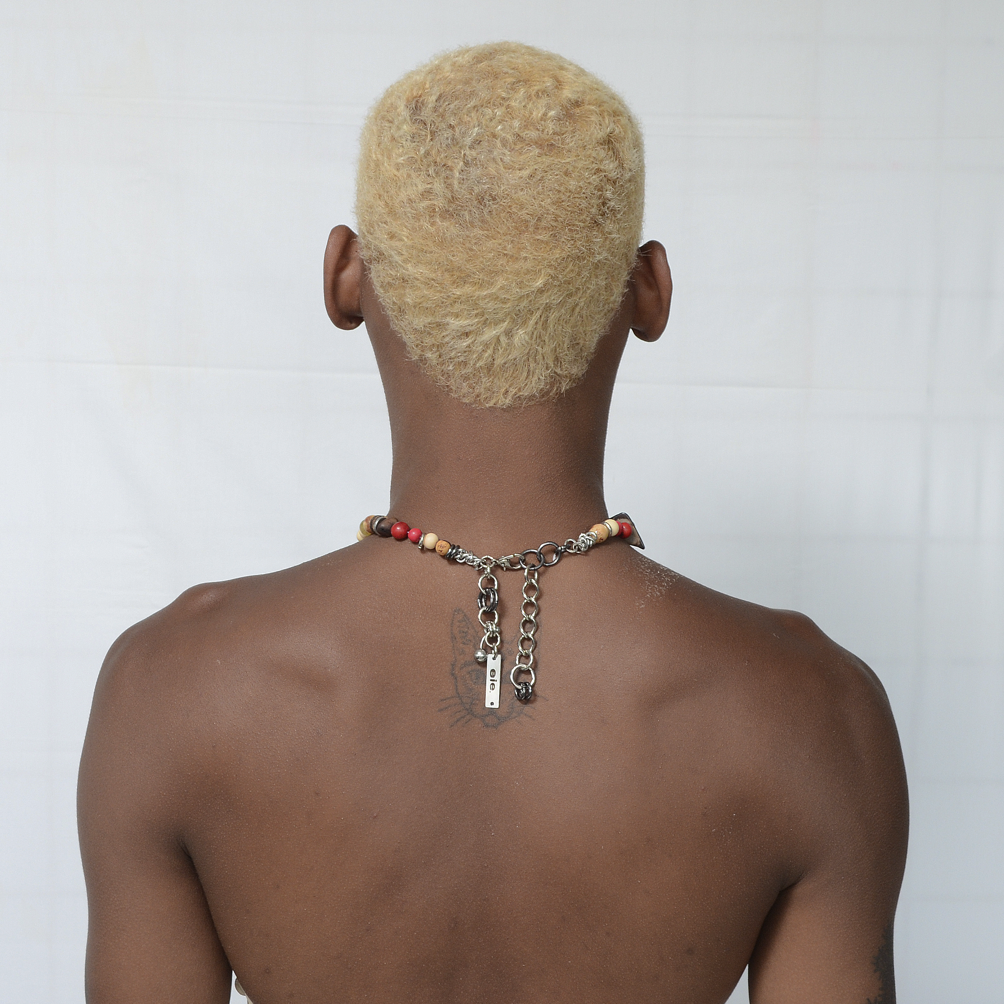 Colar produzido artesanalmente com metais em aço niquelado envernizado e inox, madeira, vidro, sementes de açaí, bacaba, jarina, coquinnho, onix, pedras olho de tigre e leopardita.