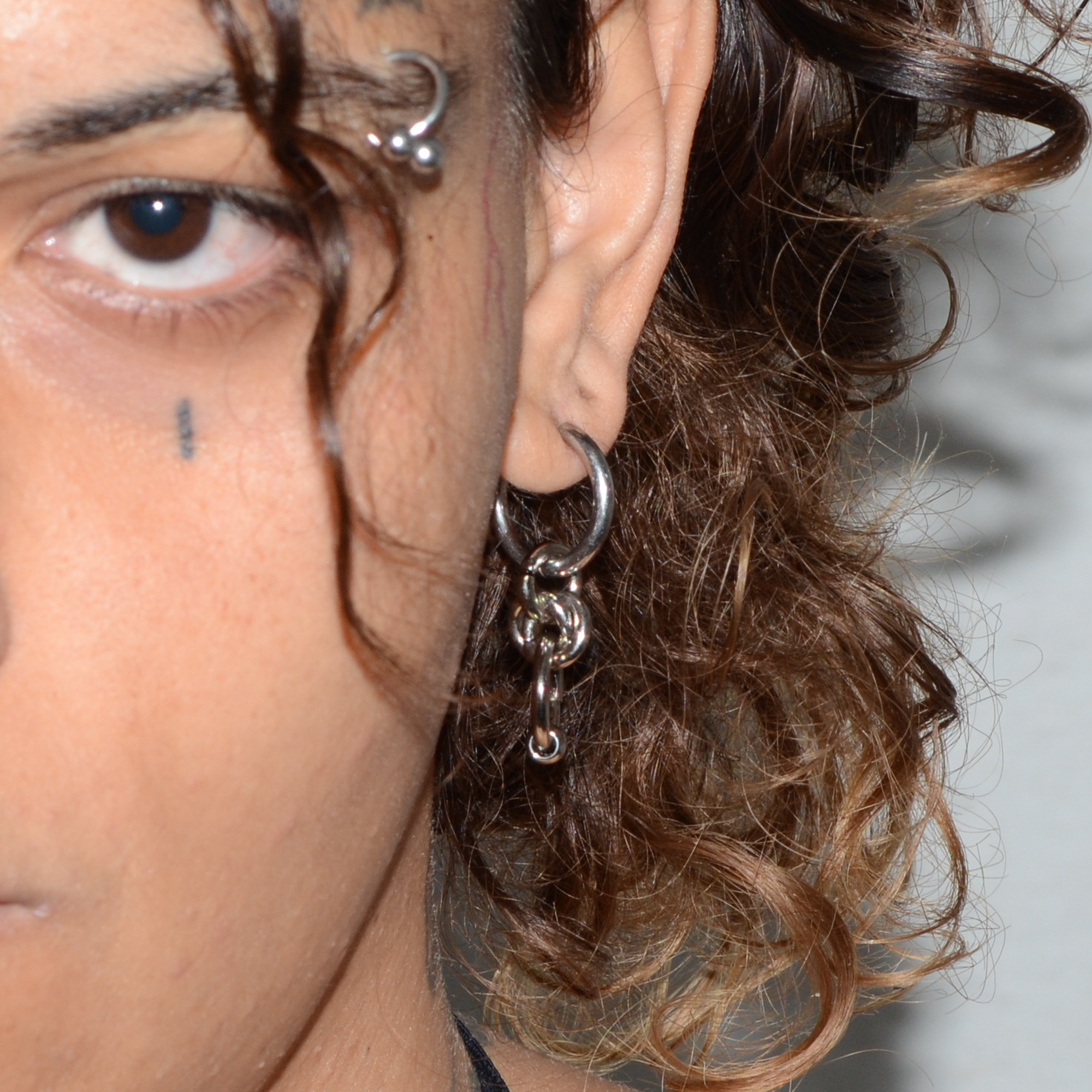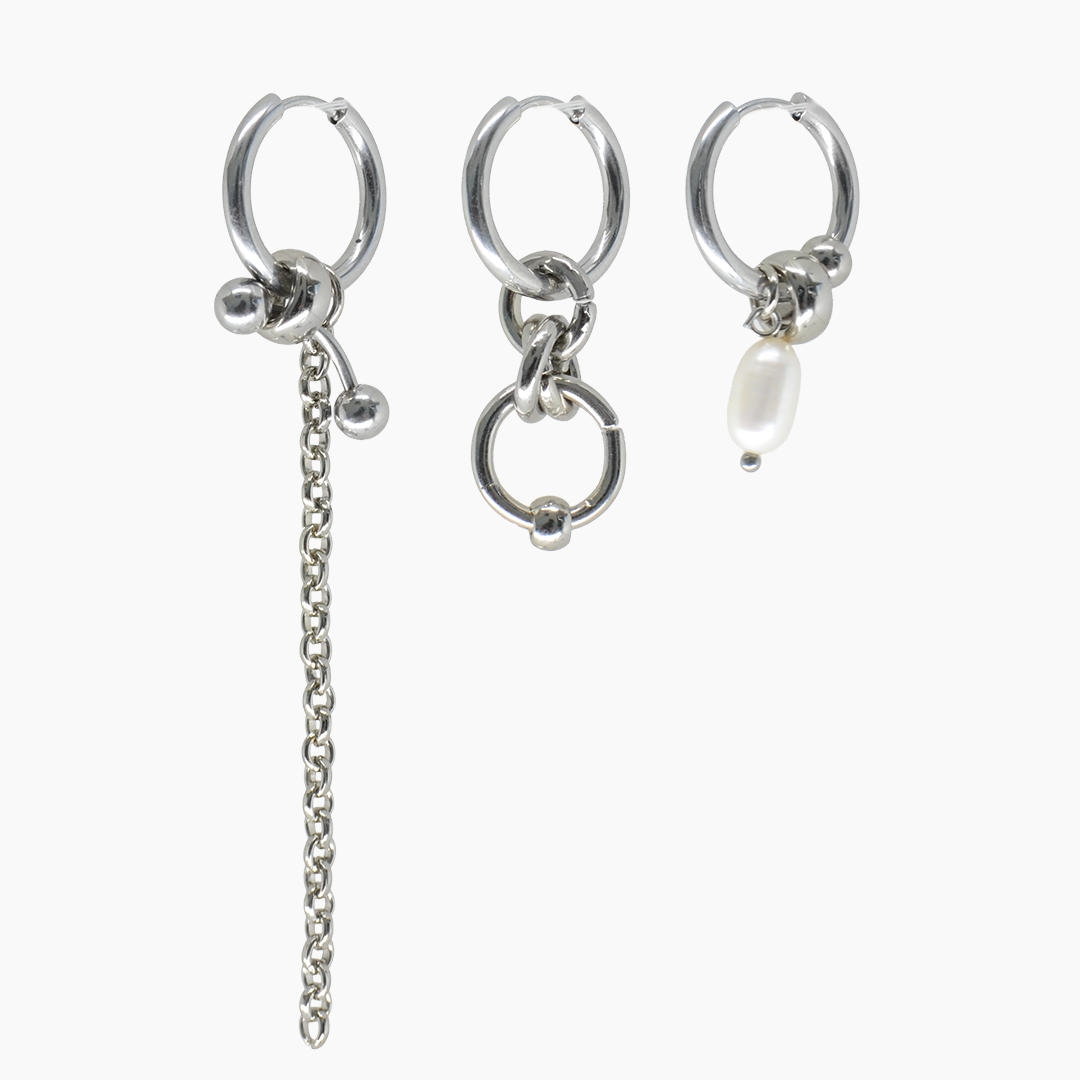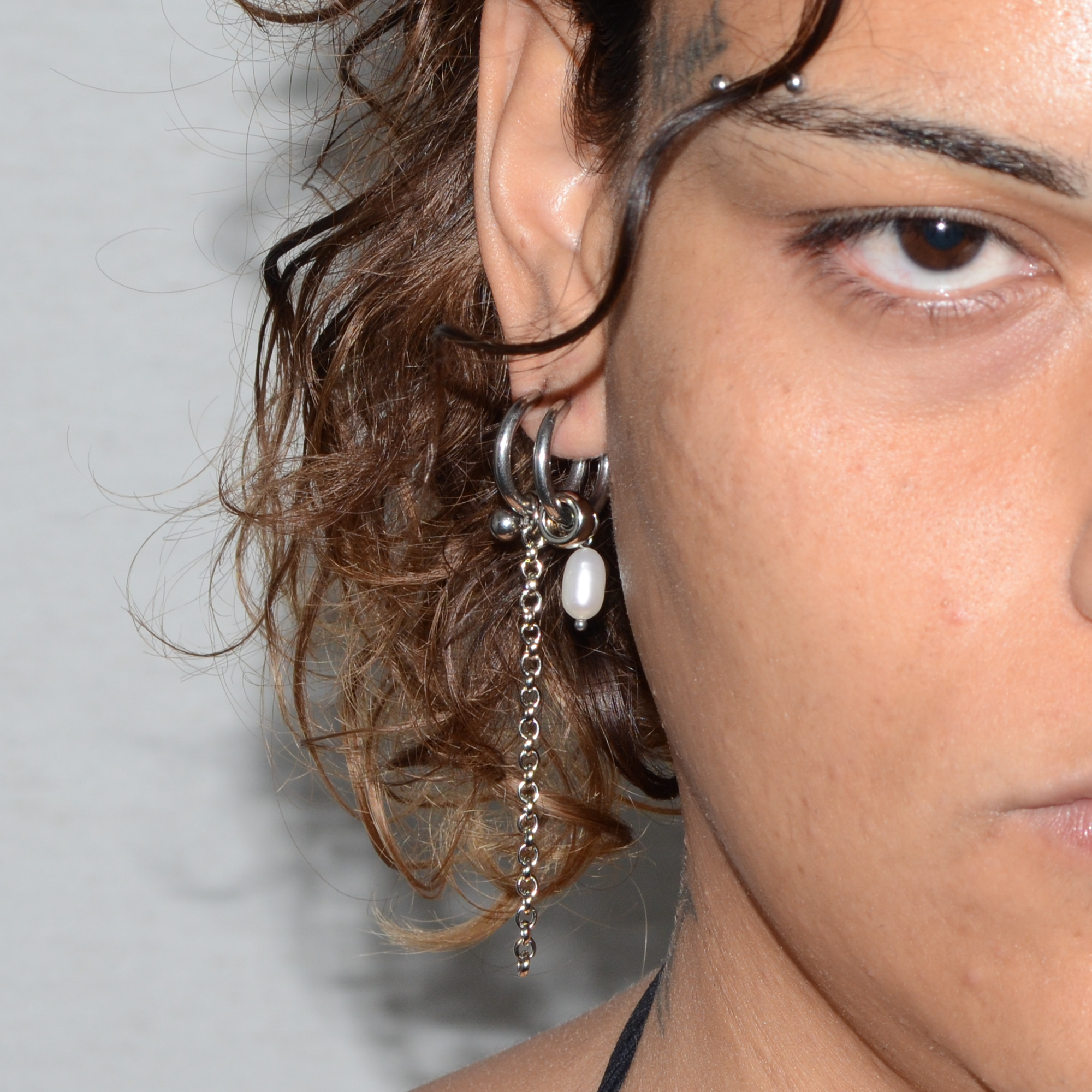 brincos produzidos artesanalmente com bases em aço inoxidável, pérola de água doce natural, piercing em aço inoxidável, e outros componentes em aço niquelado envernizado.