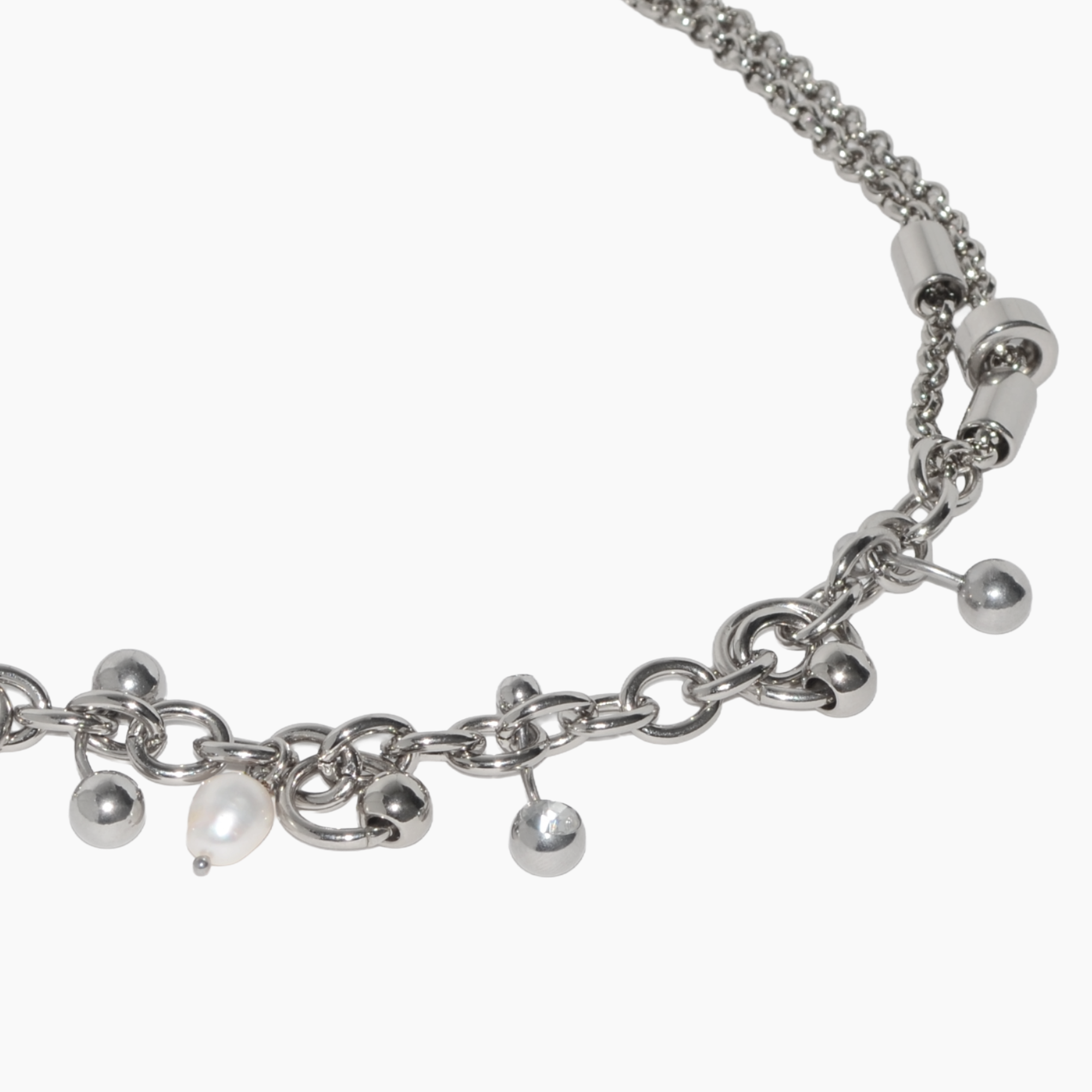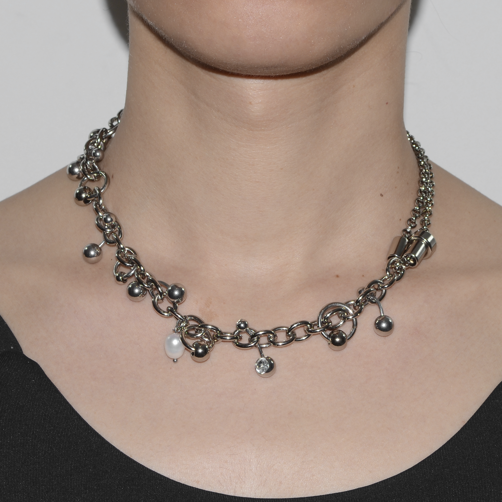 gargantilha produzida artesanalmente com correntes em aço niquelado envernizado, pérolas de agua doce naturais, piercings em aço inoxidáveis com e sem strass e outros componentes também em aço niquelado envernizado.