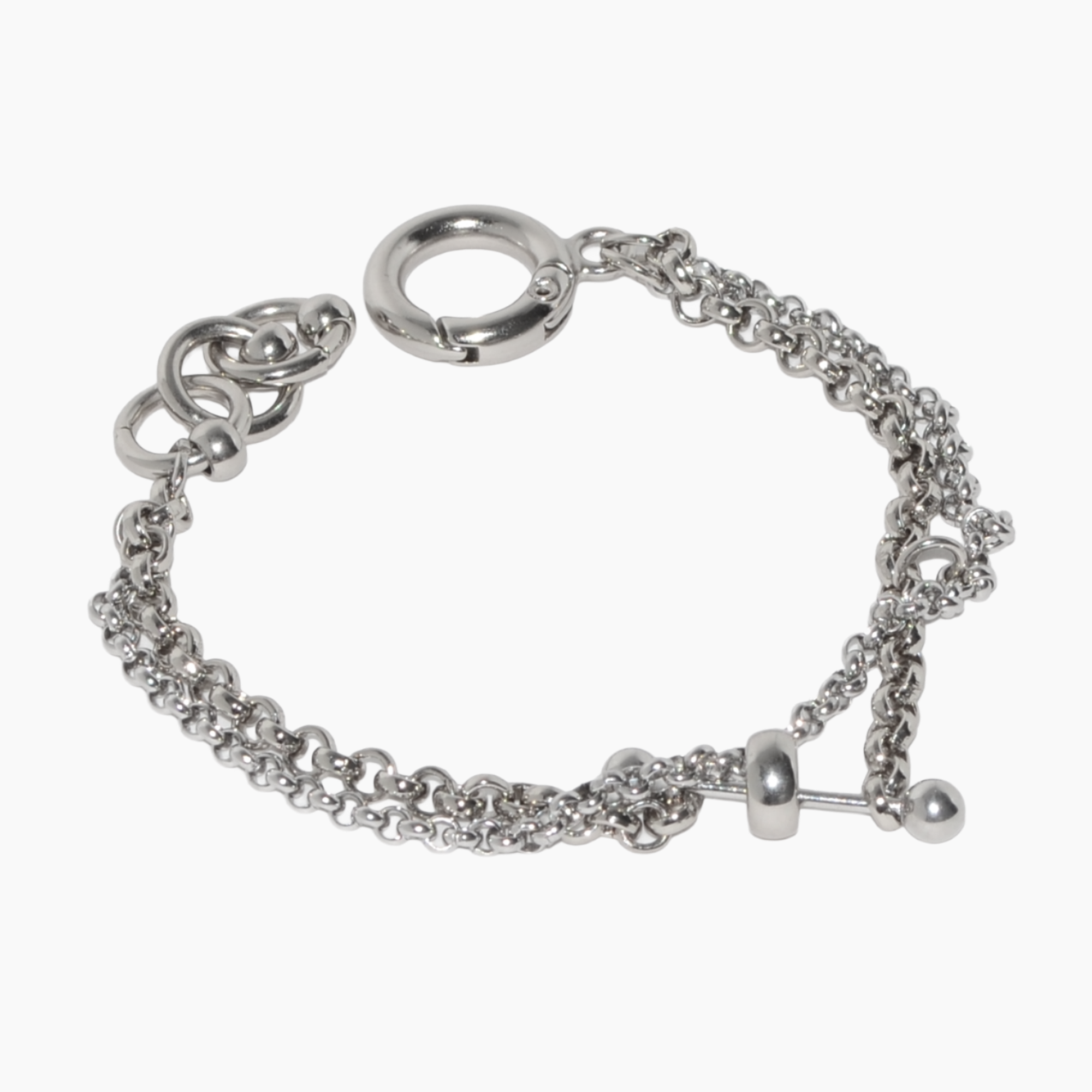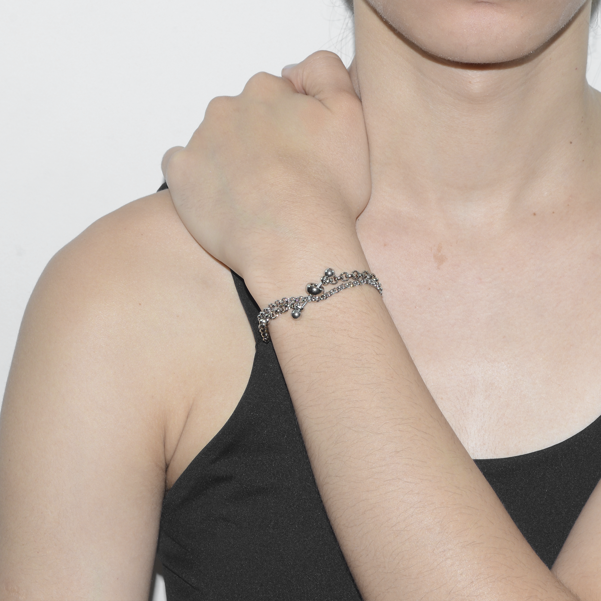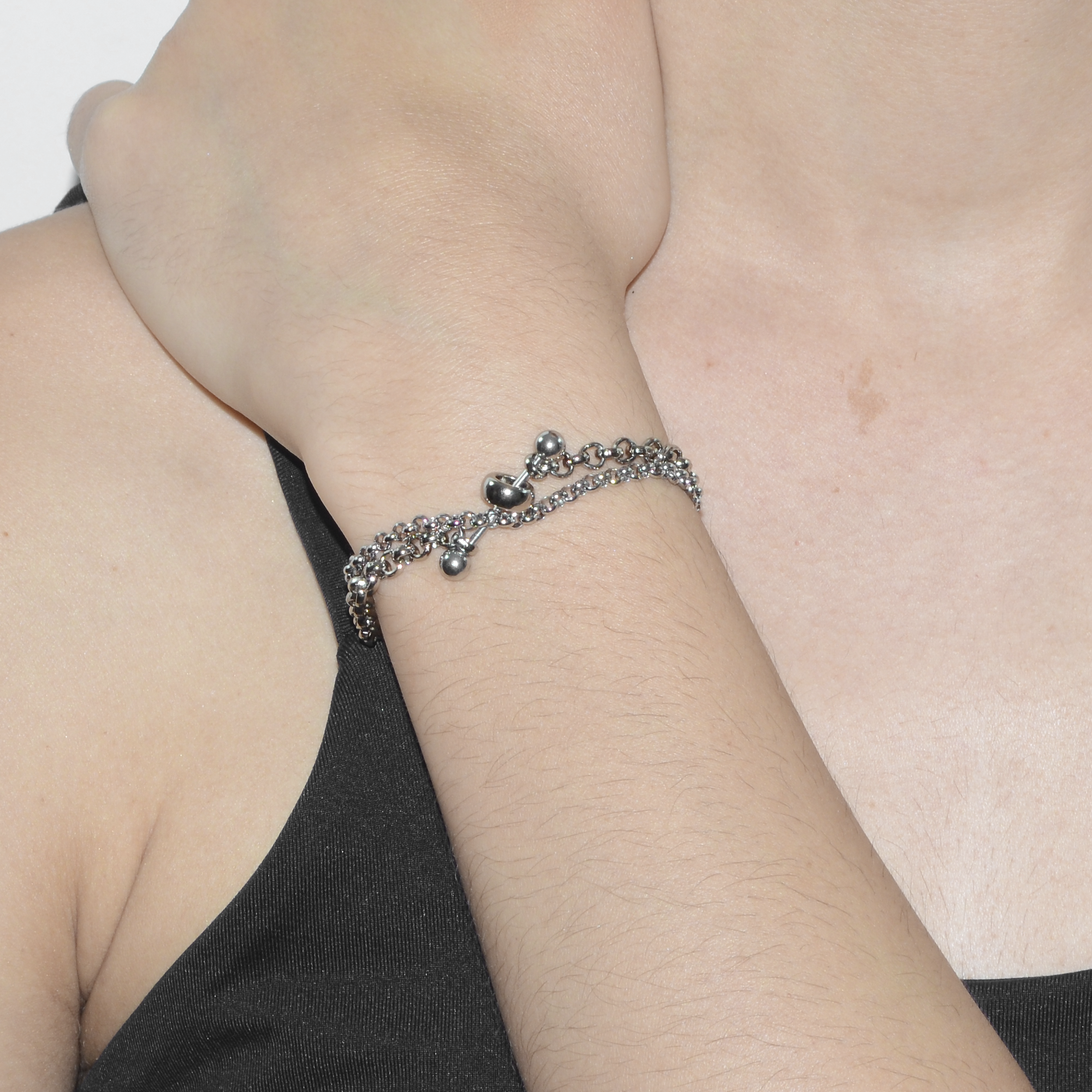 pulseira produzida artesanalmente com correntes em aço niquelado envernizado, aço inoxidável, piercings em aço inoxidável e outros componentes em aço niquelado envernizado.