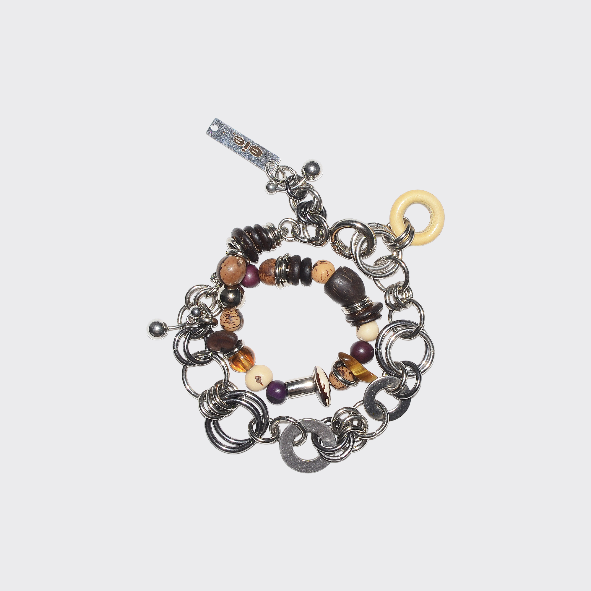 Pulseira produzida artesanalmente com metais em aço niquelado envernizado, alumínio e inox, madeira, sementes de açaí, feijão, jarina, bacaba, coquinho, coco tucumã e pedra olho de tigre.